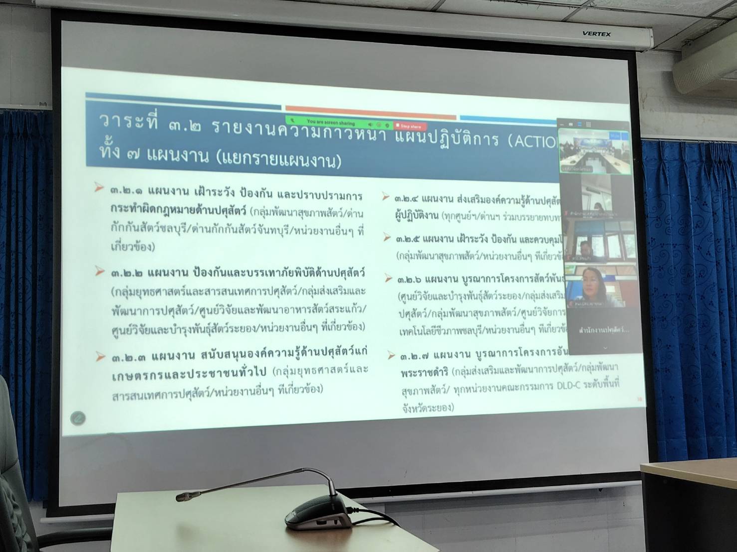โดยที่ประชุม DLD-C ได้ร่วมกันติดตาม/รายงานความก้าวหน้าตามแผนปฏิบัติการขับเคลื่อนนโยบายกรมปศุสัตว์ จำนวน 7 แผนงาน(Action plan) ประกอบด้วย