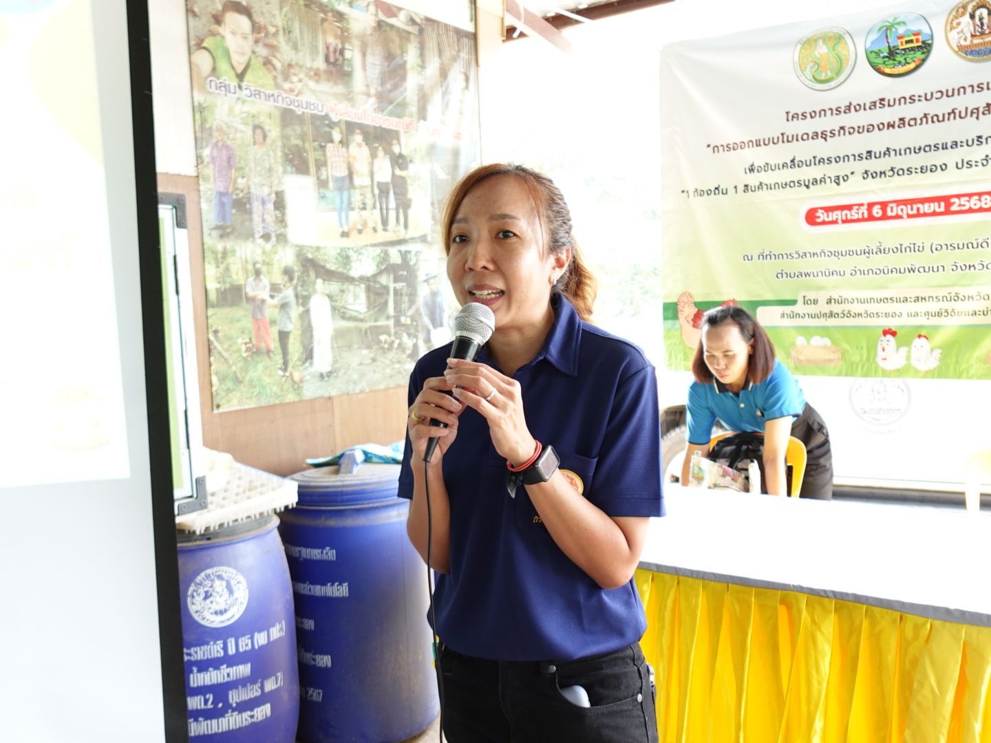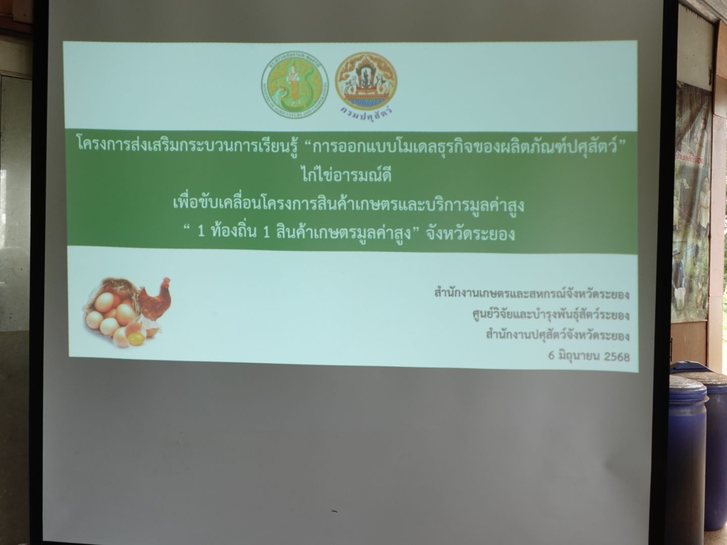 วันที่ 6 มิถุนายน 2568 เวลา 09.30 น. นายสัตวแพทย์ไทยวิวัฒน์ วรรณสุข ปศุสัตว์จังหวัดระยอง พร้อมด้วย นายสุรศักดิ์ โสภณจิตร ผู้อำนวยการศูนย์วิจัยและบำรุงพันธุ์สัตว์ระยอง นางสาวรักษิณา บ้วนกียาพันธุ์ นักวิชาการสัตวบาลปฏิบัติการ หัวหน้ากลุ่มส่งเสริมและพัฒนาการปศุสัตว์ น.สพ.พฤทธิ์ พลับสวาท ปศุสัตว์อำเภอนิคมพัฒนา และเจ้าหน้าที่กลุ่มส่งเสริมและพัฒนาการปศุสัตว์ ร่วมกับสำนักงานเกษตรและสหกรณ์จังหวัดระยอง ดำเนินกิจกรรมโครงการส่งเสริมกระบวนการเรียนรู้ การออกแบบโมเดลธุรกิจของผลิตภัณฑ์ปศุสัตว์ ไก่ไข่อารมณ์ดี เพื่อขับเคลื่อนโครงการสินค้าเกษตรและบริการมูลค่าสูง 1 ท้องถิ่น 1 สินค้าเกษตรมูลค่าสูง จังหวัดระยอง โดยมีนายธนโชค พงษ์ชวลิต เกษตรและสหกรณ์จังหวัดระยอง เป็นประธานในการเปิดกิจกรรม ณ ที่ทำการวิสาหกิจชุมชนผู้เลี้ยงไก่ไข่ (อารมณ์ดี) ชุมชนบ้านหลักร้อย ตำบลพนานิคม อำเภอนิคมพัฒนา จังหวัดระยอง เกษตรกรเข้าร่วมกิจกรรมจำนวน 20 ราย ซึ่งเป็นการบรรยายดังนี้ 1) "การจัดการการเลี้ยงไก่ไข่ (อารมณ์ดี)" โดยนางสาววัชรีพร เลื่อมใส นักวิชาการสัตวบาลปฏิบัติการ 2) "การออกแบบโมลเดลธุรกิจ ผลิตภัณฑ์ (BMC Model) ตามหลัก VRIO Model (ไข่ไก่อารมณดี)" โดยนางสาวรักษิณา บ้วนกียาพันธุ์ หัวหน้ากลุ่มส่งเสริมและพัฒนาการปศุสัตว์ 3) วิเคราะห์ออกแบบฉลากและบรรจุภัณฑ์สินค้า ทั้งนี้ เพื่อต่อยอดผลผลิตสินค้าเกษตรสู่การแปรรูปผลิตภัณฑ์ที่สามารถยกระดับมูลค่าหรือรายได้ของครัวเรือนเกษตรกรให้ยั่งยืนต่อไป
