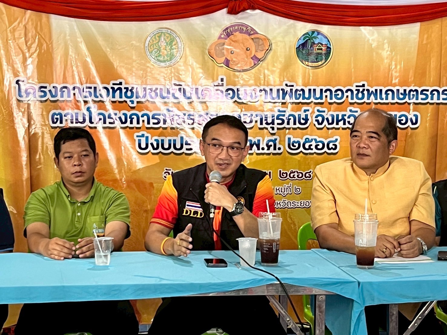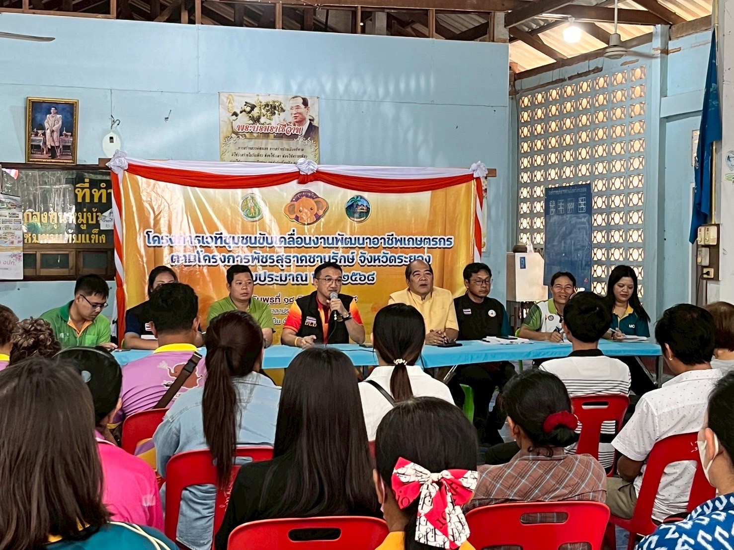 วันที่ 18 มิถุนายน 2568 เวลา 08.30 น. นายสัตวแพทย์ไทยวิวัฒน์ วรรณสุข ปศุสัตว์จังหวัดระยอง พร้อมด้วย นางสาวรักษิณา บ้วนกียาพันธุ์ หัวหน้ากลุ่มส่งเสริมและพัฒนาการปศุสัตว์ นางสาวธัญญ์พิชชา ศิริโชติวรกานน์ ปศุสัตว์อำเภอเขาชะเมา นายฤทธิชัย ศรีประเสริฐ เจ้าพนักงานสัตวบาลปฏิบัติงาน สำนักงานปศุสัตว์อำเภอเมืองระยอง เจ้าหน้าที่กลุ่มส่งเสริมและพัฒนาการปศุสัตว์ และเจ้าหน้าที่สำนักงานปศุสัตว์อำเภอเขาชะเมา เข้าร่วมการจัดเวทีประชาคมโครงการพัฒนาอาชีพเกษตรกร และมอบปัจจัยการผลิตตามโครงการพัชรสุธาคชานุรักษ์ ณ ศาลาประชาคมตำบลน้ำเป็น อำเภอเขาชะเมา จังหวัดระยอง โดยมีนายธนโชค พงษ์ชวลิต เกษตรและสหกรณ์จังหวัดระยอง เป็นประธาน ซึ่งที่ประชุมได้มีการการรายงานสรุปผลการดำเนินงานของหน่วยงานกระทรวงเกษตรและสหกรณ์ ที่เข้ามาดำเนินกิจกรรมในพื้นที่อำเภอเขาชะเมา การสนับสนุนปัจจัยการผลิตด้านพืช ประมง กล้าไม้ชนิดต่างๆ รวมทั้งรับฟังปัญหาอุปสรรค และความต้องการของชุมชน เพื่อวางแผนการส่งเสริมและพัฒนาอาชีพด้านพืช ประมง ปศุสัตว์ ให้มีประสิทธิภาพมากยิ่งขึ้น ในส่วนของสำนักนักงานปศุสัตว์จังหวัดระยอง มีการสรุปผลการดำเนินงานโครงการส่งเสริมการเลี้ยงไก่ไข่ในระยะที่ผ่านมา พร้อมทั้งส่งมอบปัจจัยการผลิตและไก่สาวพร้อมไข่ สำหรับเกษตรกรเป้าหมายของโครงการภายใต้โครงการพัชรสุธาคชานุรักษ์ จำนวน 30 ราย เพื่อส่งเสริมการเลี้ยงไก่ไข่ในเขตพื้นที่ป่ารอยต่อ 5 จังหวัด และให้กลุ่มเกษตรกรมีรายได้ที่ยั่งยืนต่อไป