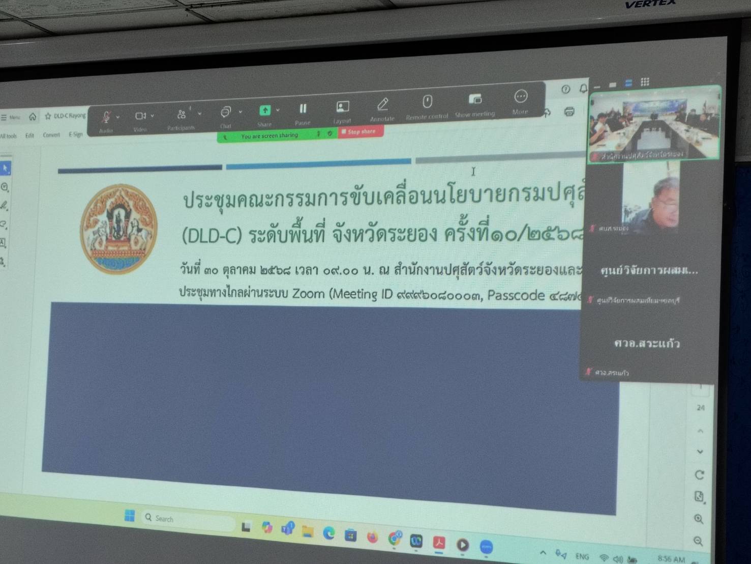 วันที่ 30 ตุลาคม 2568 เวลา 09.00 น. นายสัตวแพทย์ไทยวิวัฒน์ วรรณสุข ปศุสัตว์จังหวัดระยอง เป็นประธานการประชุมคณะกรรมการขับเคลื่อนนโยบายกรมปศุสัตว์ (DLD-C) ระดับพื้นที่จังหวัดระยอง และการประชุมข้าราชการและพนักงานราชการ ครั้งที่ 10/2568 ประจำเดือนตุลาคม 2568 โดยมีหน่วยงานคณะกรรมการร่วมประชุม ได้แก่ ศูนย์วิจัยและพัฒนาการสัตวแพทย์ภาคตะวันออก ศูนย์วิจัยและบำรุงพันธุ์สัตว์ระยอง ศูนย์วิจัยและพัฒนาอาหารสัตว์สระแก้ว ศูนย์วิจัยการผสมเทียมและเทคโนโลยีชีวภาพชลบุรี ด่านกักกันสัตว์ชลบุรี และด่านกักกันสัตว์จันทบุรี พร้อมด้วย หัวหน้ากลุ่มพัฒนาคุณภาพสินค้าปศุสัตว์ กลุ่มพัฒนาสุขภาพสัตว์ กลุ่มส่งเสริมและพัฒนาการปศุสัตว์ กลุ่มยุทธศาสตร์และสารสนเทศการปศุสัตว์ ฝ่ายบริหารงานทั่วไป และปศุสัตว์อำเภอทั้ง 8 อำเภอ โดยรับทราบนโยบายการปฏิบัติ รับฟังผลการดำเนินงาน ปัญหา อุปสรรค ข้อเสนอแนะ และแนวทางการขับเคลื่อนงานตามภารกิจรับผิดชอบ ระเบียบและแผนการปฏิบัติการ การเร่งรัดเบิกจ่ายงบประมาณ ติดตามผลการปฏิบัติงานต่างๆ การชี้แจงแนวทางการดำเนินโครงการ “คนไทย กินเนื้อโคไทย” รณรงค์ส่งเสริมการบริโภคเนื้อโคไทย เพื่อช่วยแก้ไขปัญหาราคาโคเนื้อตกต่ำ ช่วยกระตุ้นเศรษฐกิจ และให้ผู้บริโภคเข้าถึงง่ายในราคาที่เหมาะสม งานตามนโยบายเร่งด่วนของกรมปศุสัตว์และกระทรวงเกษตรและสหกรณ์ เพื่อสร้างความเข้าใจ ซักซ้อมแนวทางการดำเนินงานร่วมกัน อันจะเป็นการสนับสนุนและเพิ่มประสิทธิภาพในการปฏิบัติงานของเจ้าหน้าที่ในระดับพื้นที่ให้มากยิ่งขึ้น ผ่านระบบประชุมทางไกล Zoom Meeting และ ณ ห้องประชุมสำนักงานปศุสัตว์จังหวัดระยอง